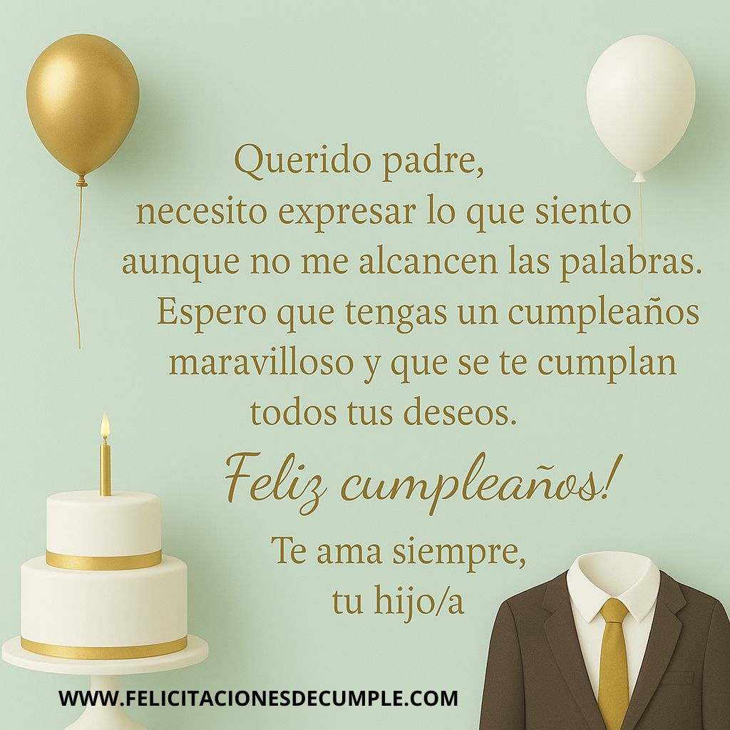 ⦁ Querido padre, necesito expresar lo que siento aunque no me alcancen las palabras. Espero que tengas un cumpleaños maravilloso y que se te cumplan todos tus deseos. ¡Feliz cumpleaños! Te ama siempre, tu hijo/a.
