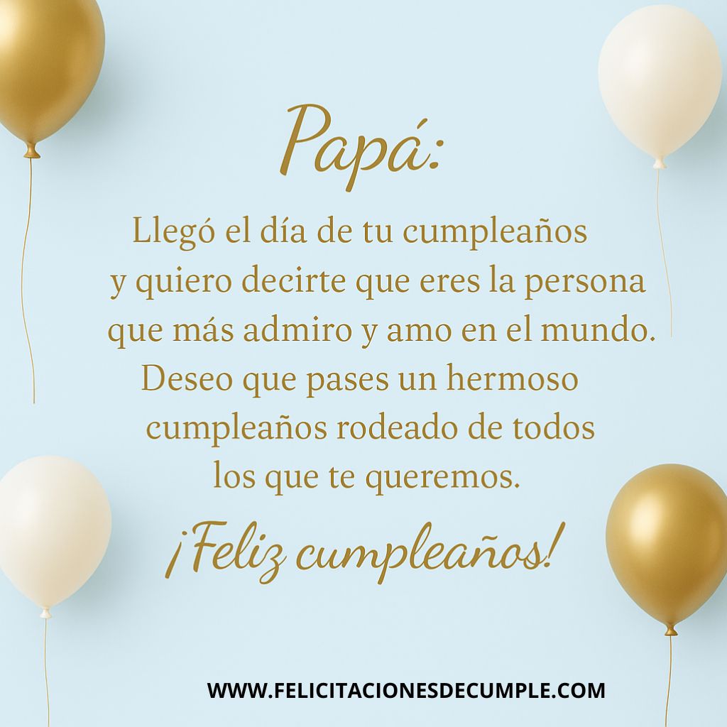 ⦁ Papá: Llegó el día de tu cumpleaños y quiero decirte que eres la persona que más admiro y amo en el mundo. Deseo que pases un hermoso cumpleaños rodeado de todos los que te queremos. ¡Feliz cumpleaños!