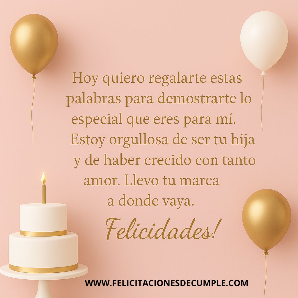 ⦁ Carta para cumpleaños de papá: Hoy quiero regalarte estas palabras para demostrarte lo especial que eres para mí. Estoy orgullosa de ser tu hija/o y de haber crecido con tanto amor. Llevo tu marca a donde vaya. ¡Felicidades!
